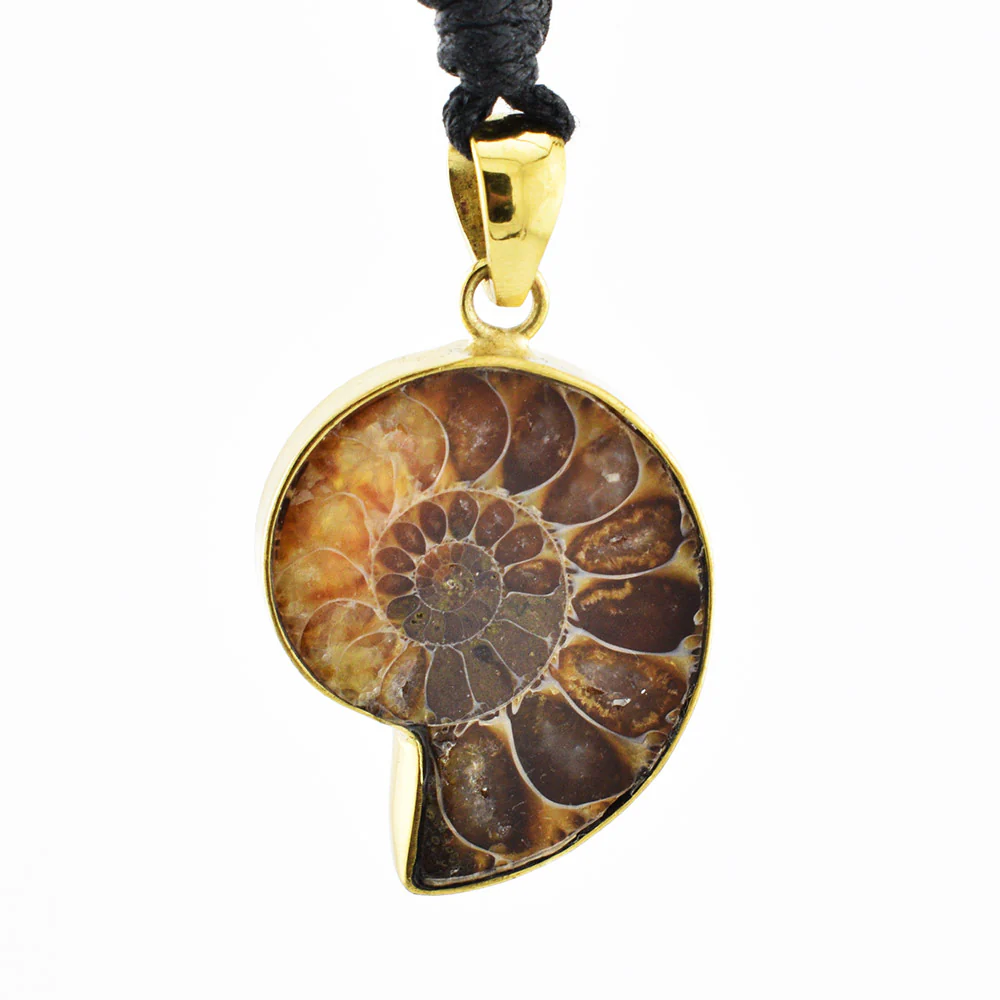 Ammonite fossil pendant encased in golden brass. They are about 3cm long and hang on fully adjustable waxed cotton thread.Â