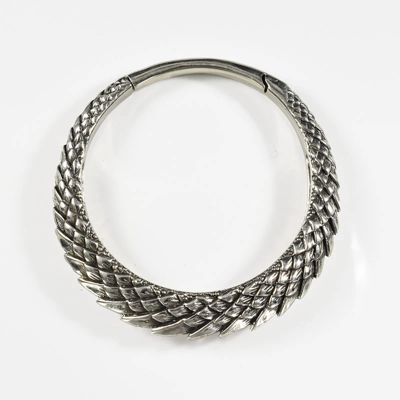 Minimum hole: 4mm A pair of hand cast silver brass 'Dragon' or reptile skin ear hangers. They are fairly large hoops measuring about 6cm across. They are hinged and click to close. They will fit in stretches of just 4mm and above.