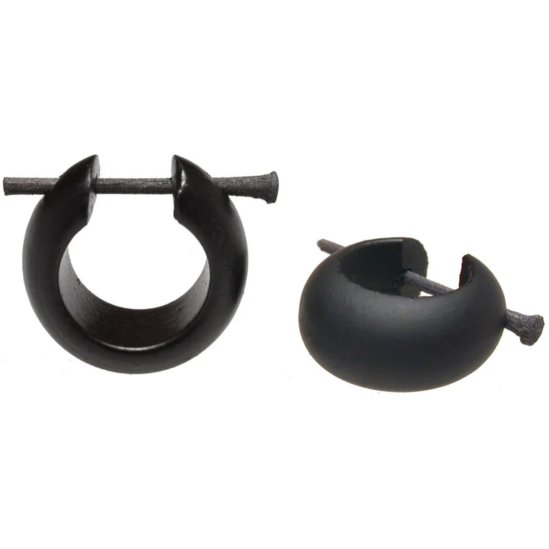Hand carved in very dark brown, almost black Iron wood, these 'Huggies' sit closely around the lobe. Secured by a wooden stick, this is a very popular style of tribal wooden earring. They are about 15mm across. This item does come as a pair!