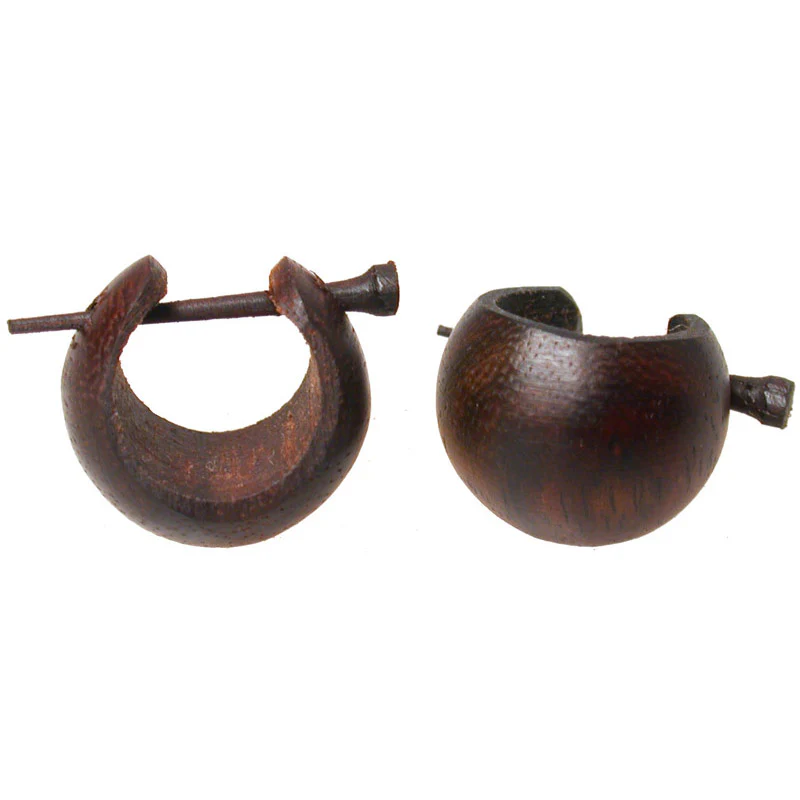 Hand carved in dark brown wood, these 'Huggies' earrings sit closely around the lobe. Secured by a wooden stick, this is a very popular style of wooden earring. About 15mm across. This item does come as a pair!