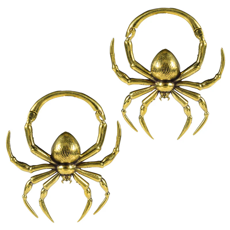 Minimum hole: 2mm Spider ear hangers. A pair of hand cast clicker ear hangers / weights made from golden brass. They are about 5cm long. Perfect for wearing through ear tunnels. They will fit in stretches of 2mm and above. They click open and shut.
