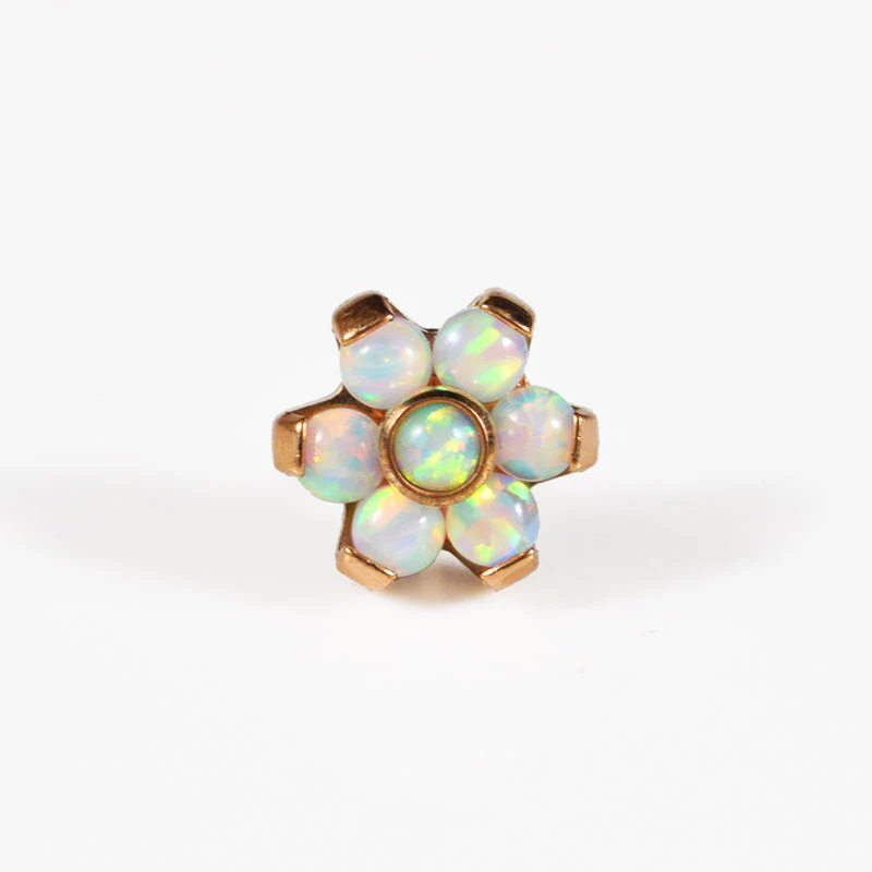 Top quality G23 Grade Titanium push fit labret. 1.2mm (16G). Featuring 7 opalite stones on rose gold titanium bar and setting. The flower is 5mm in diameter and the base is 4mm. This items comes with both the titanium bar and the threadless end.