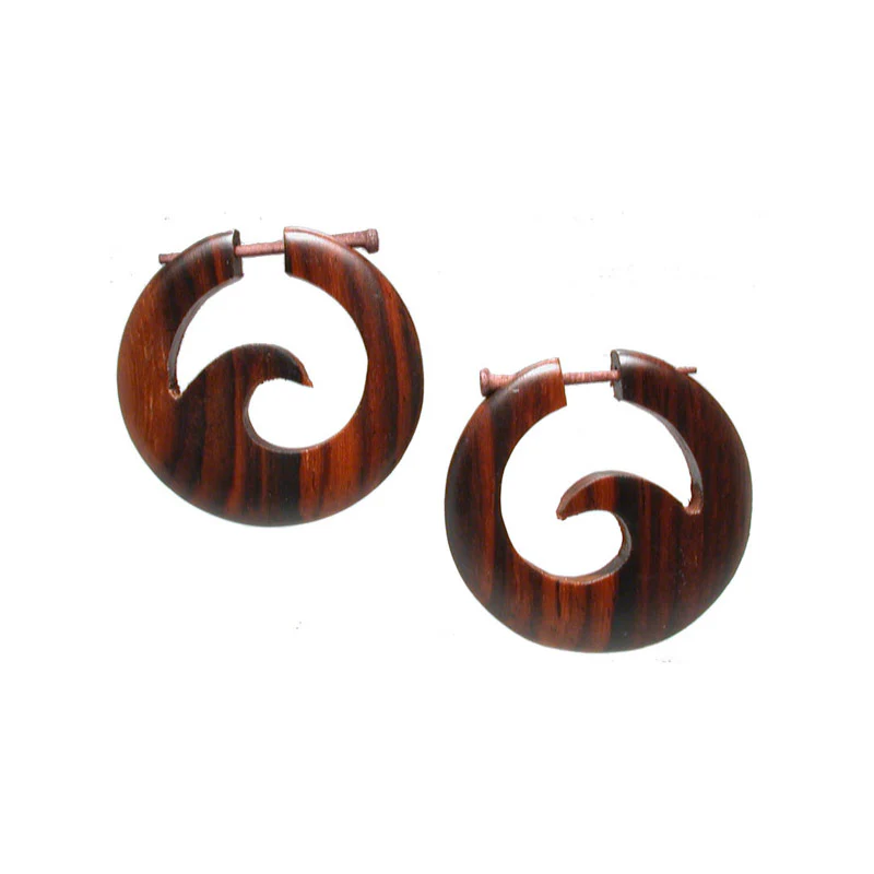 Carved wooden 'stick' earrings. A wave in a circle design. They are about 30mm across, and about 4mm thick This item does come as a pair!